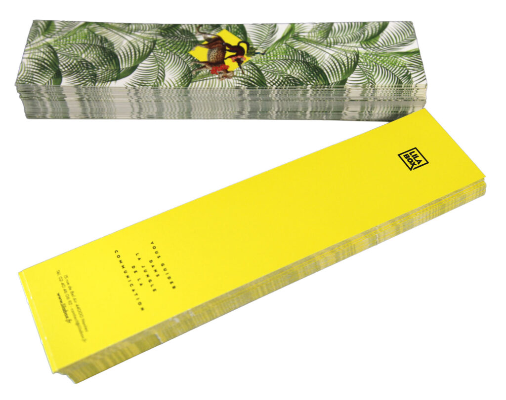 Nous proposons des marque-pages au format 5 x 20 cm sur un élégant papier couché mat 350g de fabrication française. Un grand classique indémodable.